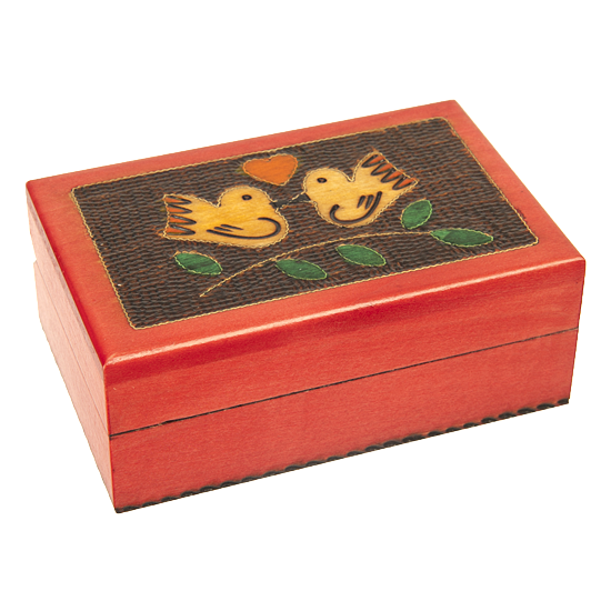 Birds kissing on a tree branch with a small heart. This box features elegant Polish brass-work, vibrant colors, and a very time consuming background effect where hundreds of small, controlled woodburn marks are made to create a semi-organic, warm pattern. This background technique is seldom used even in Poland, due the sheer amount of labor involved.