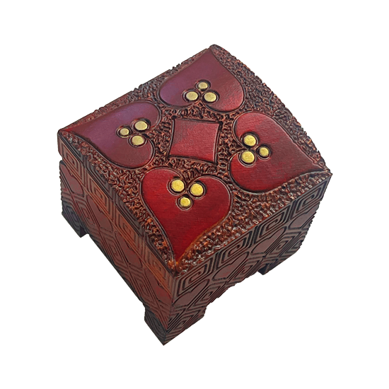 Four outward facing red hearts on each corner, a diamond placed in the center. This small trunk has a convex hinged lid, metallic gold paint accents, and an exhaustive amount of hand-executed pyrography that produces an intricate array of markings and patterns.