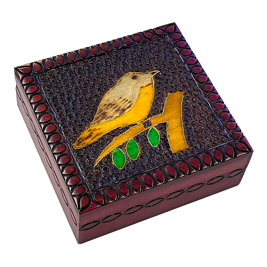 Bird sitting on a branch with green leaves, brass inlay, woodburned background, red felted bottom.