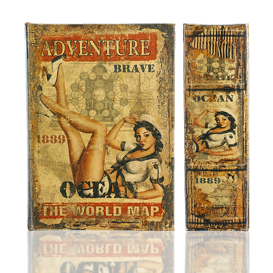 Single book box with classic American pin-up illustration, "Adventure", features a hinged metal lock plate and includes two keys. Place metal plate in downward closed position, insert key, rotate key left to lock and right top open.