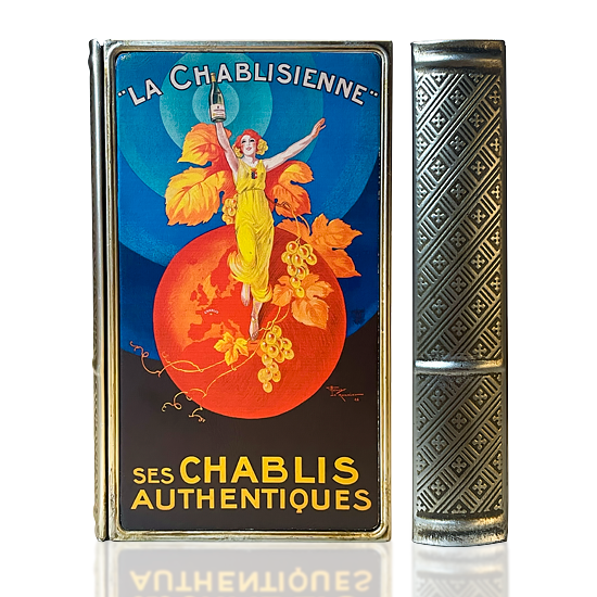Vintage poster for "Chablis", a dry white wine made using Chardonnay grapes in France. Artist is Henri Le Monnier (1893-1978), this piece is circa 1925. Lucious fall scenery with grapes, a map, and a beautiful young lady holding a bottle of wine. This book box features a metallic tin frame and spine.