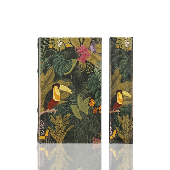 A Toucan, maybe named Sam, in green jungle with colorful florals.