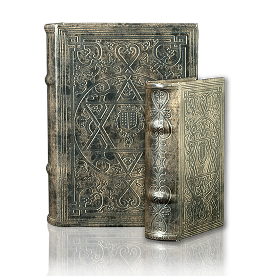 This book box features an impressed, ornamental Star of David (also known in Hebrew as the “Shield of David” or “Magen David”) on an antiquated synthetic leather. A symbol of Judaism, it has a long history; said to be derived from Medieval times.