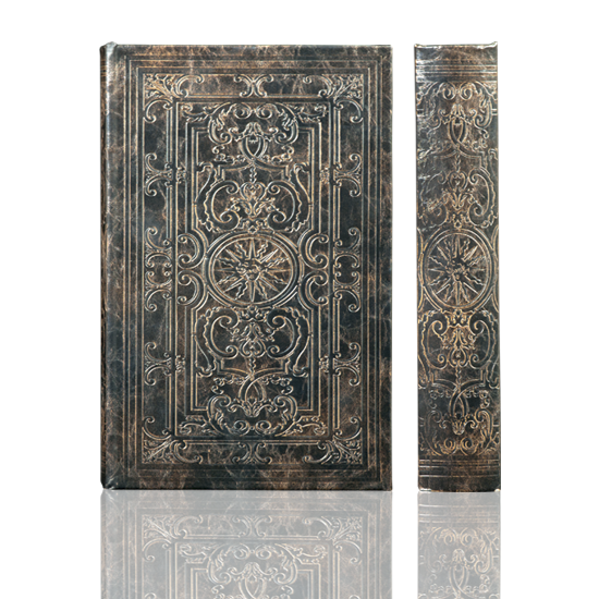 Book box wrapped in antiqued leatherette, featuring impressed ornamental celestial patterns.
