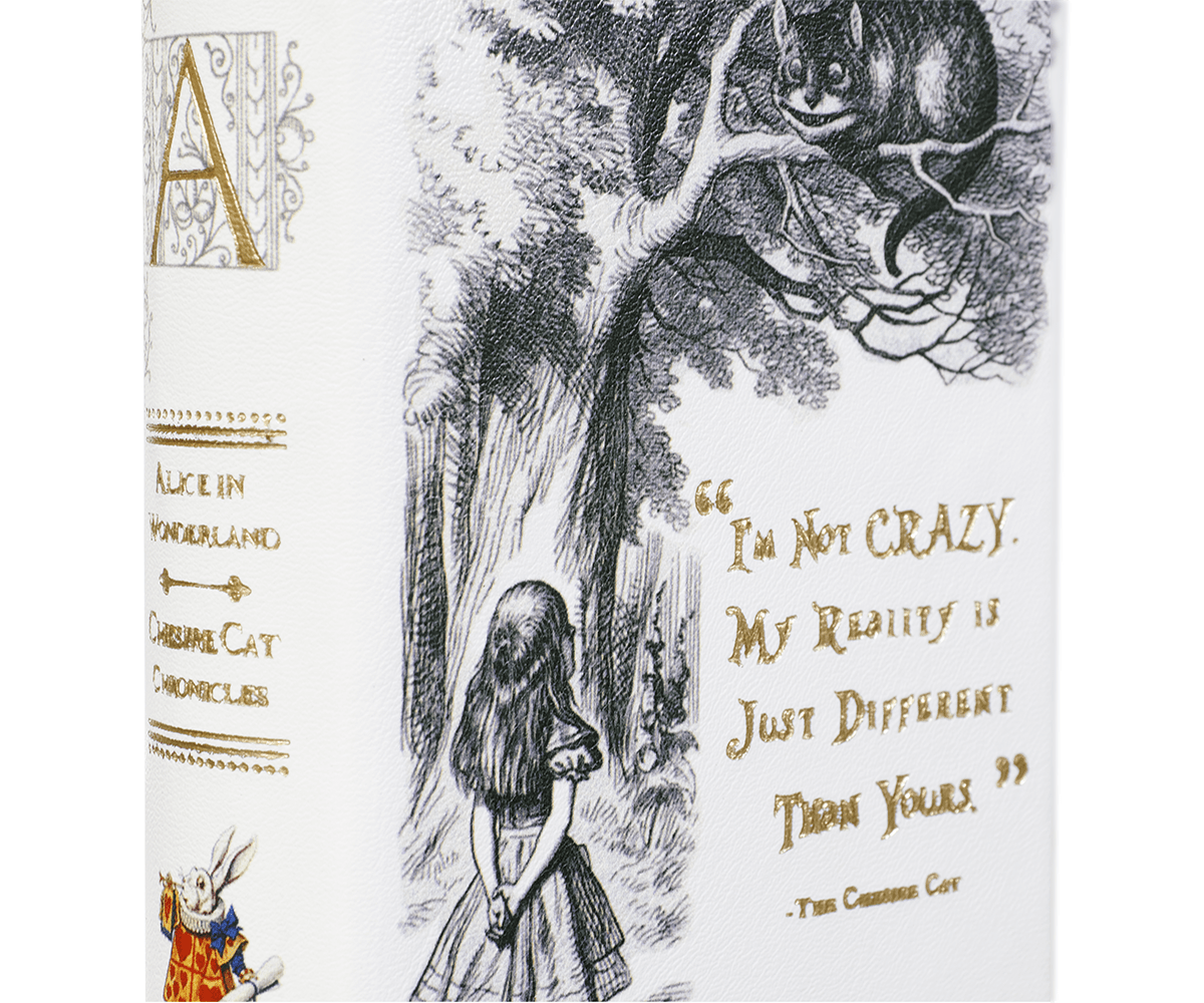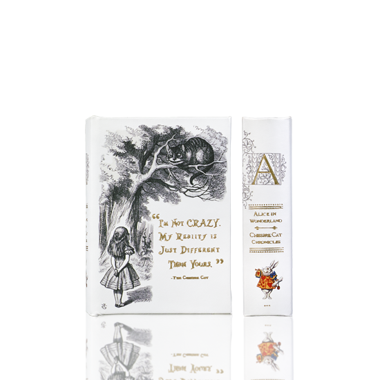 Gorgeous black & white Alice in Wonderland book box titled "Chronicles of the Cheshire Cat" on spine, debossed gold foil text. Illustration by John Tenniel, England (1820 – 1914).