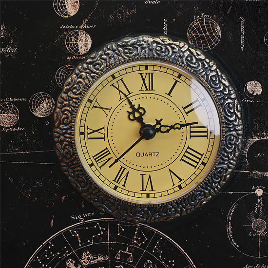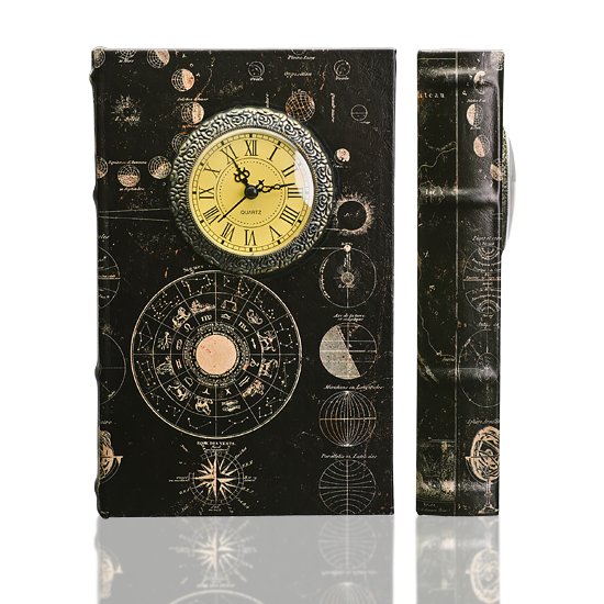 Single book box with an astrological design and retrofitted quartz clock, requires a single AA battery to operate (not included). Insert positive ( + ) side of battery first, then negative ( - ).