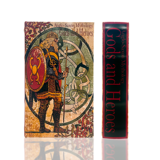 Medium book featuring an armored Viking with spear and shield and Celtic patterns. The title reads "Anglo-Saxon Mythology, Gods and Heroes", based on Norse Mythology.
