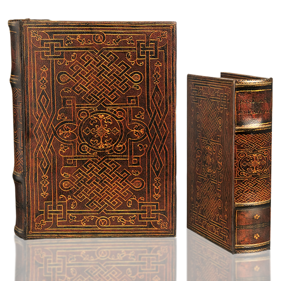 Book box with Celtic Knot theme, titled "Eternal Knot", introduced 2015. This book features an intricate long knot, with faux gold rendering of the line on a background of deep burgundy with peeking rustic reds.