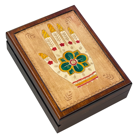 A wood box with elaborately detailed "henna" hand design, a traditional & non-permanent body tattoo art using pigment made from the henna tree, a red felted interior floor. Assorted colors