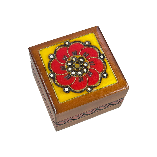 Subtle redesign for 2025. Small wooden box designed by Teresa, focusing on our traditional background. Minimalistic yet subtly ornate with brass-work, motif is floral. Red felt, magnetic closure. Assorted colors: Red, yellow, blue.