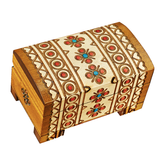 Classic executive brown wooden box, swirls, circles, and cross hatching on the outer border that extends into the side trim.