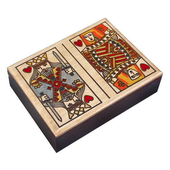 Vintage playing card design, raw varnished wood top, with intricate patterns. Sides are dyed brown. This is a playing card box, fits two standard size playing card decks on the inside.
