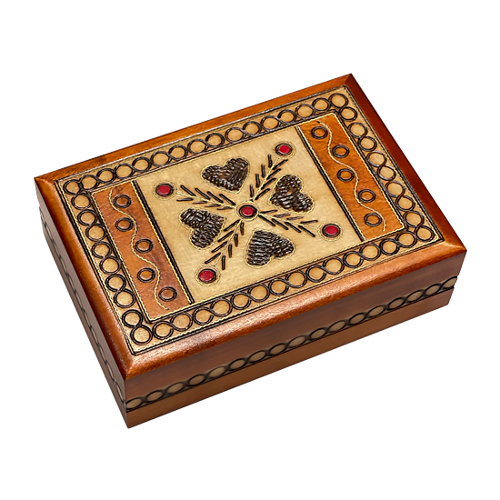 Traditional Polish rectangular box with woodburned hearts and brass inlay, red felted bottom, assorted colors.