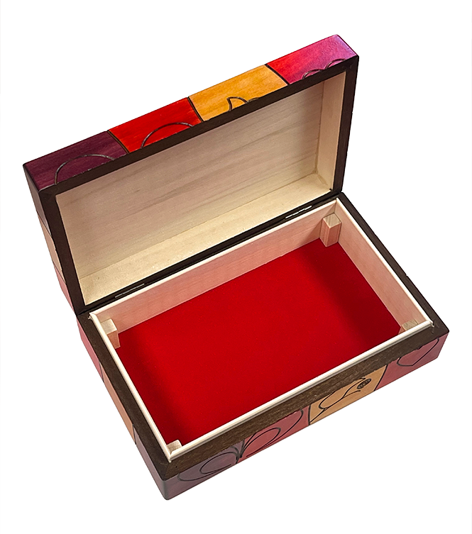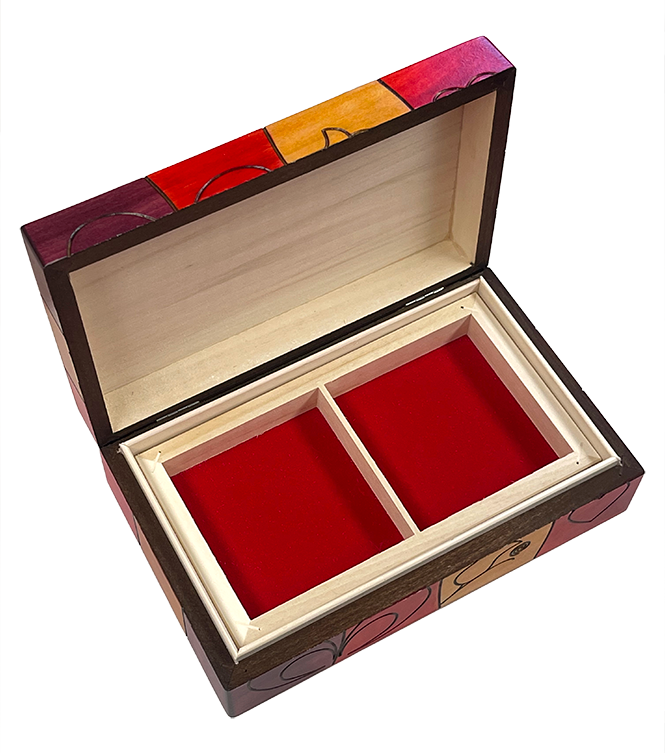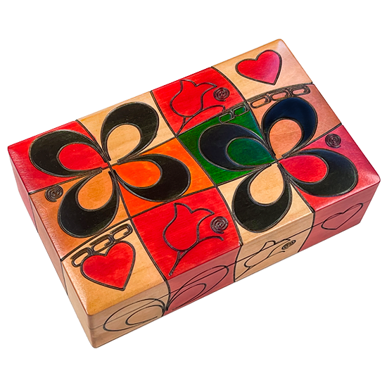 Large chest with removable tray, retro color scheme, features hearts, roses, and geometrical flower patterns. Red/Beige color scheme.