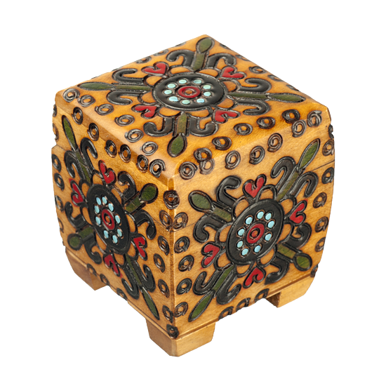 Traditional small rounded chest with ornate decoration.