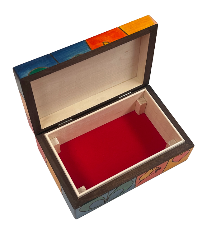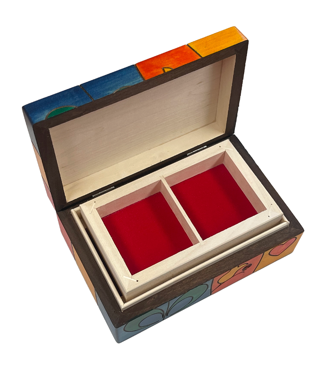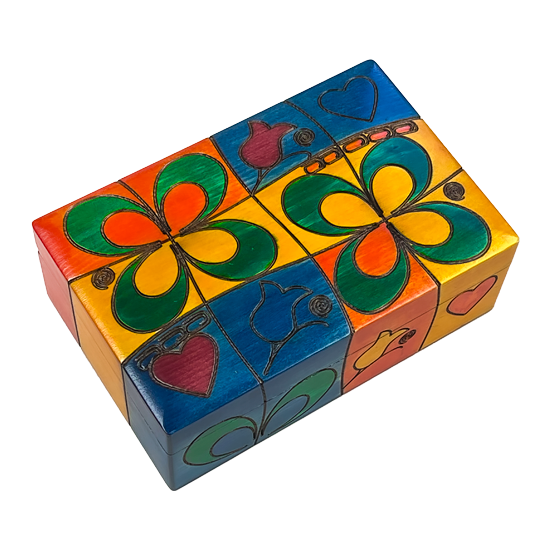Medium chest with removable tray, retro color scheme, features hearts, roses, and geometrical flower patterns. Blue/Orange color scheme.