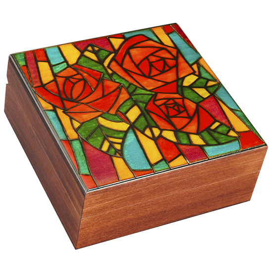 Inspired by the stained glass mosaics often found in churches, this "Enchanted Box" features a bright and colorful, geometrically cut rose mosaic. The color stains used for this box are prominent stained glass colors: red, yellow, and turquoise.