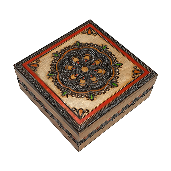 Square box with floral ornamented crest, featured varnish raw wood and light brown stain.