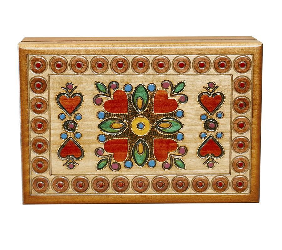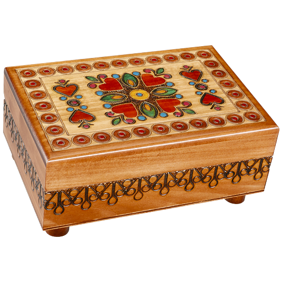 Modified traditional design by EWB, features 6 hearts, circular patterned border, waved brass inlay and a lot of cute & colorful decorative elements. A wooden puzzle box, the left and right front facing peg feet twist to open & unlock.