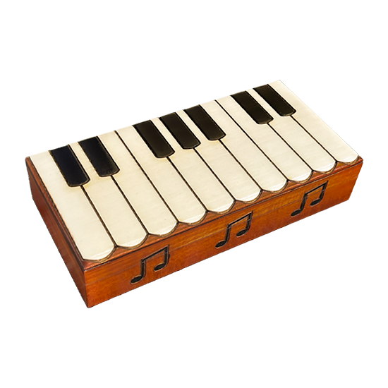 Medium-high gloss box in the style of piano keys, music notes alone the side, red felt bottom.