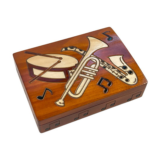 Medium-high gloss semi-round top box with assorted musical instruments, red felt bottom.