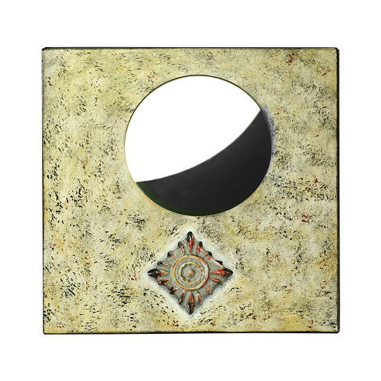 Last remaining new stock of our metal mirror. Hand painted welded metal frame with mirror and metal accents. This mirror has fixturing/hanging features on the back. Special price.