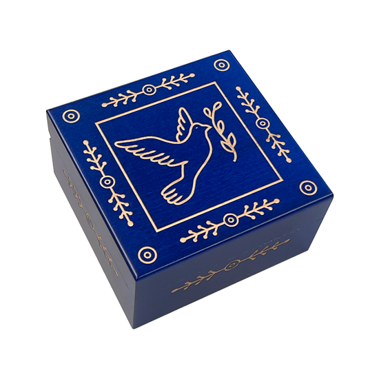 Dove with olive branch on saturated blue stained background, surrounded by ornaments, small size.