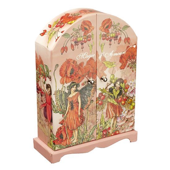 Red circle top paper box with black haired fairies, flowers, and 3 removable drawers.
