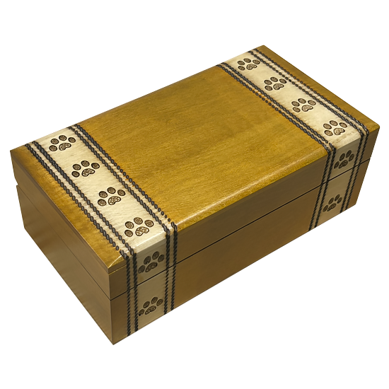 Medium sized box in tan stained wood -- 2 ribbons left and right, adorned with paw prints.