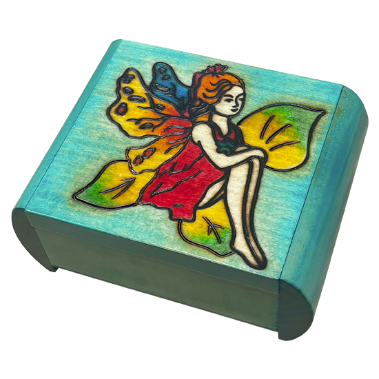 Medium secret box with sliding sides, a colorful fairy with orange hair sits & waits, observation nature -- on turquoise background.