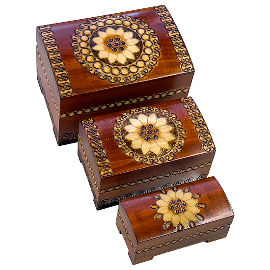 A nested trio of floral oriented boxes with abundant trim and lace inspired patterns. The larger box houses the medium box; medium box houses the smaller. Can be resold as a set or individually. Assorted colors: magenta, red, and brown.
