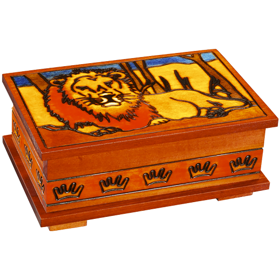 A vintage puzzle box by EWB, reintroduced from our design vault for 2018. Features an elegant lion basking in the shade beside the desert, vibrant orange-reddish maine. Side trim is decorated with royal crowns to commemorate the King of the animals. Puzzle box: Front facing panel slides to the right to open.