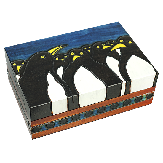 One of our oldest designs, T-5 focuses on a group of adorable penguins. The penguin bodies are stained with an application of black ink stain with white & yellow acrylic paint accents for the eyes, beak, and tummies that gives this unique wooden box a 3-dimensional appearance. An EWB original.