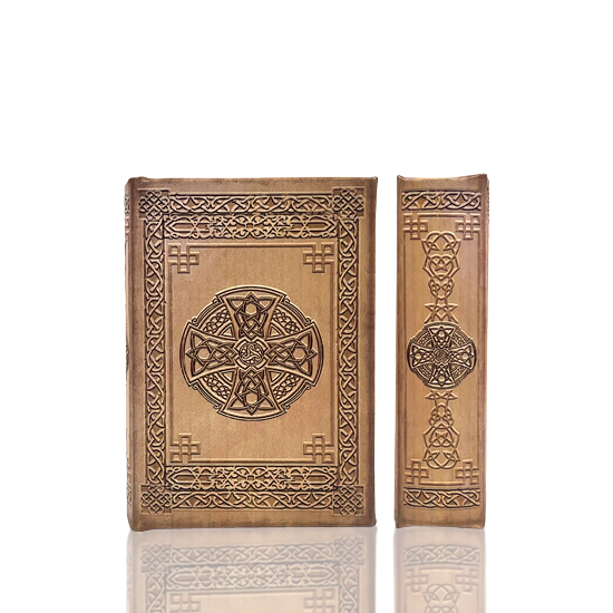 Small book featuring 3D effect with raised knot pattern on front and spine. Made to look like aged/tanned leather.