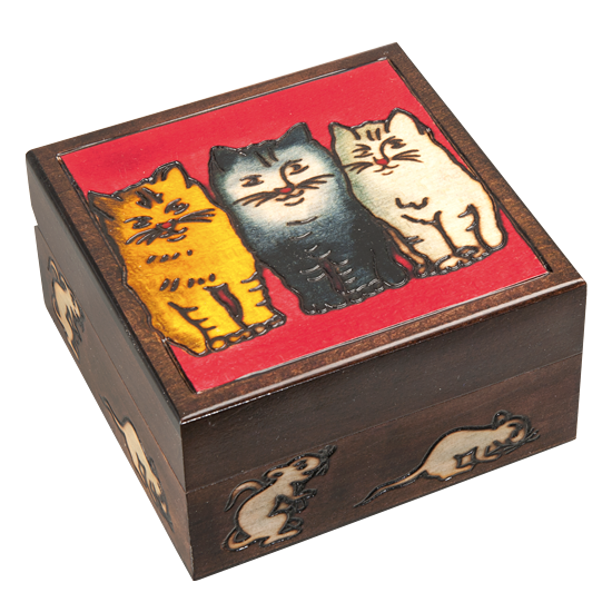 Three seated cats pose on a square box; two unsuspecting mice on the front trim accompany them. The interior floor of this box has red felt trim.
