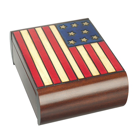 Secret box with American flag, stars are painted with metallic gold paint. Secret opening, sides slide forward to open.
