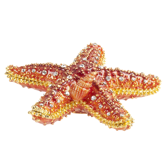 Bejeweled red starfish with life-like texture and small red shell. Hand painted on heavy-weight metal alloy with gold metallic lining, opens in half to reveal compartment for small jewelry.