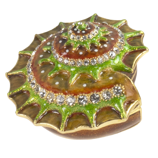Bejeweled spiral seashell. Hand painted on heavy-weight metal alloy with gold metallic lining, opens in half to reveal compartment for small jewelry.